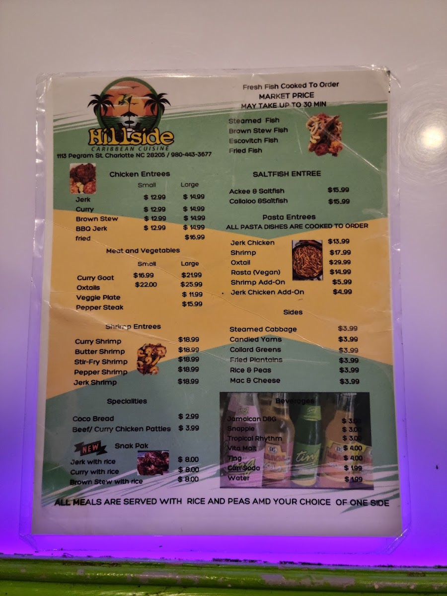 Welcome to Hillside Caribbean Cuisine, where the vibrant spirit of Jamaica meets the heart of Charlotte, NC. Nestled at 1113 Pegram St, this burgeoning restaurant is not just a place to eat; it's an invitation to experience authentic Jamaican culture through food. From the moment you step in, the warmth of the owners and staff creates an inviting atmosphere that feels like home.